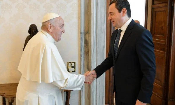 “Ndonëse disi ngathët hedhja hapat përpara, ecje e shkurtër m’u duk mua ajo nëpër disa korridore të gjata deri te biblioteka e Atit të Shenjtë. Për shkak të Papa Françeskut doja të mbërrij sa më shpejt tek ai, për shkak të pikturave mahnitëse të Rafaelit nëpër mure e tavan, silueta e shefit të protokollit po zvogëlohej teksa më printe. Ekziston dritarja e përsosur për të parë Sheshin e Shën Pjetrit me kupën qiellore sipër. Disa sekonda, jo më shumë, sepse syri im i djathtë tashmë kërkonte derën pas së cilës sakaq u shfaq mikëpritja e bardhë dhe e ngrohtë. Papa Françesku është shumë njerëzor e fort social. Ai bënte pyetje për Kosovën, rininë e fëmijët, arsimin e punën, historinë e kulturën, vlerat dhe të ardhmen. Flet për paqen me dashuri, për popujt me dhembshuri. Interesohet në një mënyrë të angazhuar, dëgjon me një durim që të përvetëson”, ka shkuar Kurti në Facebook, duke publikuar edhe disa fotografi nga takimi.
