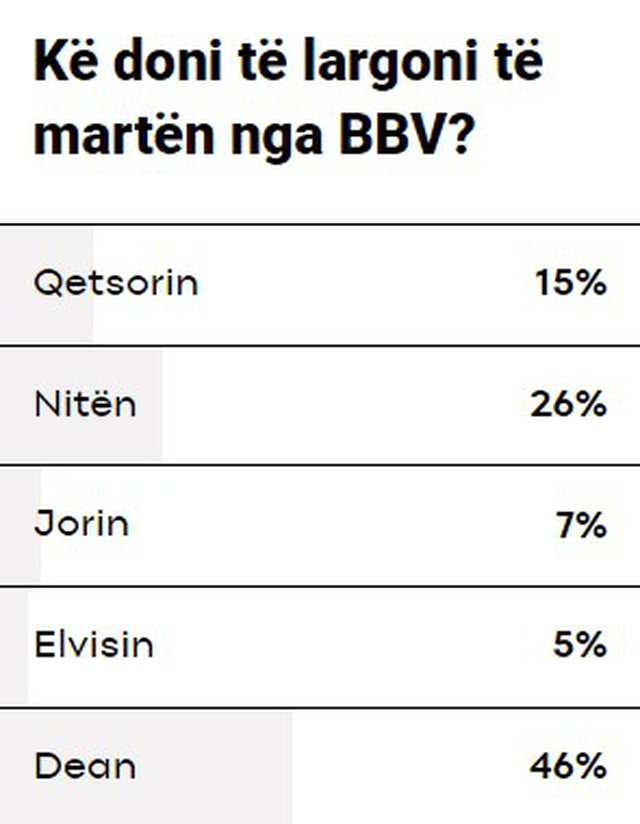 Elvisi, Nita, Dea, Jori dhe Qetsori janë në nominim dhe njëri prej tyre do të lërë shtëpinë këtë të martë. Nga sondazhi i realizuar nga xing.al rezulton se më e votuara për të dalë është Dea.